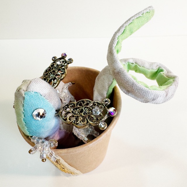 きれいなカップにつられてちょっぴり入ってみた宝石竜たちです。 どうやら抜け出しがたい魅力があるようですね。 宝石の瞳を持つ竜【宝石竜】。 年経た【宝石】が【竜】になったのか 【竜】のみが持つ煌びやかな瞳を 【宝石】と呼ぶようになったのかは 定かではありません。 残念ながら彼らは近すぎず遠すぎない過去に死に絶え 今は装飾品でその瞳を見られるのみです。 こちらはかつての【宝石竜】たちの 生まれたばかりの姿を再現したものです。 あなたが大切に愛で続けてくださると 再び【宝石】の瞳に命が宿るかもしれません。 「それでも、わたしたちは輝くの。」 サイズ約10cm×10cm 高さ7〜9cm(ポーズによります) (瞳はクリスタルガラスを使用しています) (写真と実物の色味が異なって見える可能性がございます) 取り扱いについて 骨格が針金で出来ております。 直射日光に当てず、湿気や水分に触れないようにしてください。 持ち上げるときはカップ部分をつかんでください。 カップに固定されているので絶対に本体を引っ張り出さないでください。 ※屋内に置いて楽しんでいただく前提でお作りしております。 強い力を加えると破損する恐れがあります。 ※ツノ部分は特に破損しやすい部分です。 あまり強くお手を触れないようにしてください。 竜たちもちょっぴり怒ります。 ※宝石竜は全て1点ものです。再販はございません。