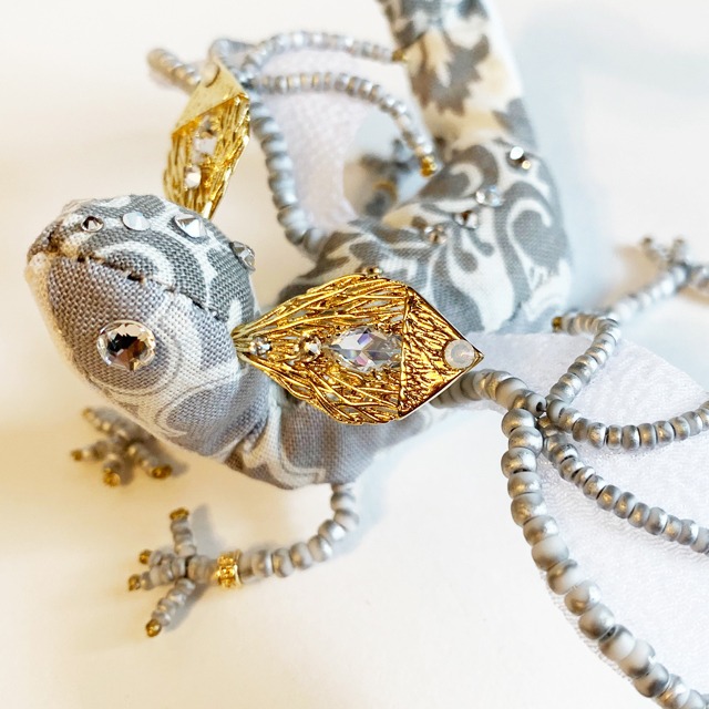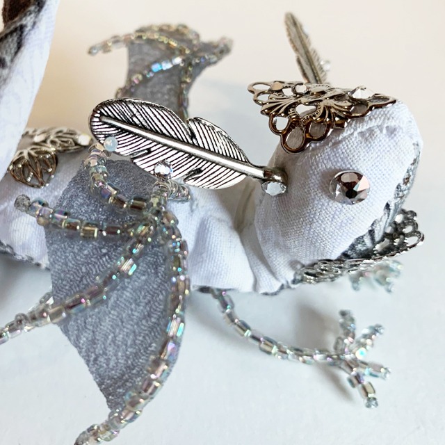 煌めく 星の 宝石竜 翼にクリスタルガラスを散りばめております。 宝石の瞳を持つ竜【宝石竜】。 年経た【宝石】が【竜】になったのか 【竜】のみが持つ煌びやかな瞳を 【宝石】と呼ぶようになったのかは 定かではありません。 残念ながら彼らは近すぎず遠すぎない過去に死に絶え 今は装飾品でその瞳を見られるのみです。 こちらはかつての【宝石竜】たちの 生まれたばかりの姿を再現したものです。 あなたが大切に愛で続けてくださると 再び【宝石】の瞳に命が宿るかもしれません。 「それでも、わたしたちは輝くの。」 【商品説明】 室内用オブジェです。 サイズ約10cm×10cm 高さ7〜9cm (宝石竜より翼が大きくなっております) (瞳はクリスタルガラスを使用しています) (写真と実物の色味が異なって見える可能性がございます) 取り扱いについて 骨格が針金で出来ております。 直射日光に当てず、湿気や水分に触れないようにしてください。 持ち上げるときはしっぽ部分をつかんでください。 可変性はございますが、原型のまま動かさないでください。 ※屋内に置いて楽しんでいただく前提でお作りしております。 強い力を加えると破損する恐れがあります。 足や指の角度程度でしたら、軽い力でクイっとしていただくと動きます。 足が地に着いていないような感じになってしまいましたら 足を上から軽く押して接地面に置いてみてください。 地に足が着きます。 ※ツノ部分は特に破損しやすい部分です。 あまり強くお手を触れないようにしてください。 竜たちもちょっぴり怒ります。 ※宝石竜は全て1点ものです。再販はございません。