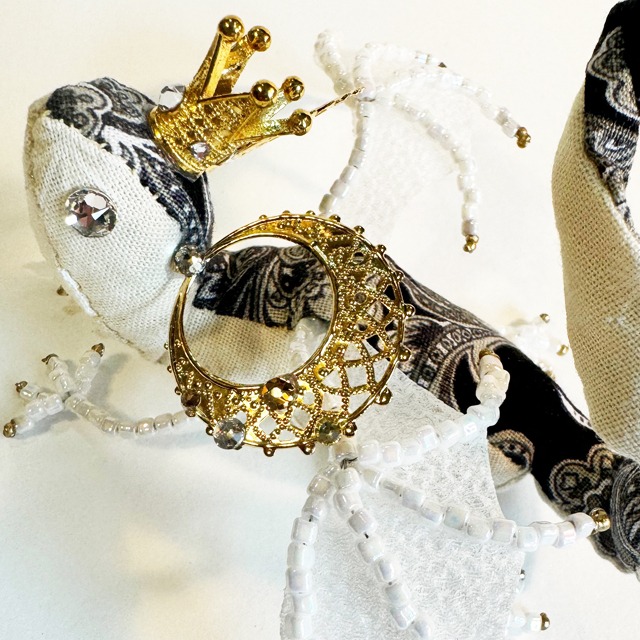ティアラをかぶった、豪華でおしゃれな宝石竜のお姫様です。 宝石の瞳を持つ竜【宝石竜】。 年経た【宝石】が【竜】になったのか 【竜】のみが持つ煌びやかな瞳を 【宝石】と呼ぶようになったのかは 定かではありません。 残念ながら彼らは近すぎず遠すぎない過去に死に絶え 今は装飾品でその瞳を見られるのみです。 こちらはかつての【宝石竜】たちの 生まれたばかりの姿を再現したものです。 あなたが大切に愛で続けてくださると 再び【宝石】の瞳に命が宿るかもしれません。 「それでも、わたしたちは輝くの。」 サイズ約10cm×10cm 高さ7〜9cm (宝石竜より翼が大きくなっております) (瞳はクリスタルガラスを使用しています) (写真と実物の色味が異なって見える可能性がございます) 取り扱いについて 骨格が針金で出来ております。 直射日光に当てず、湿気や水分に触れないようにしてください。 持ち上げるときはしっぽ部分をつかんでください。 可変性はございますが、原型のまま動かさないでください。 ※屋内に置いて楽しんでいただく前提でお作りしております。 強い力を加えると破損する恐れがあります。 足や指の角度程度でしたら、軽い力でクイっとしていただくと動きます。 足が地に着いていないような感じになってしまいましたら 足を上から軽く押して接地面に置いてみてください。 地に足が着きます。 ※ツノ部分は特に破損しやすい部分です。 あまり強くお手を触れないようにしてください。 竜たちもちょっぴり怒ります。 ※宝石竜は全て1点ものです。再販はございません。